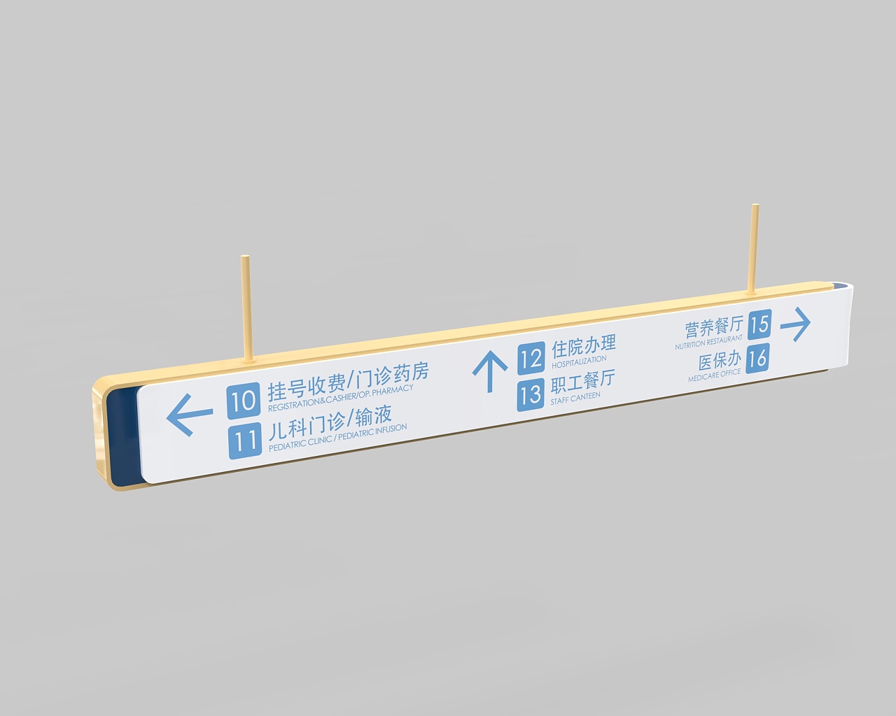 7、楼层号牌及电梯牌;8、通道分流吊牌,调式灯箱;9、科室名称牌;